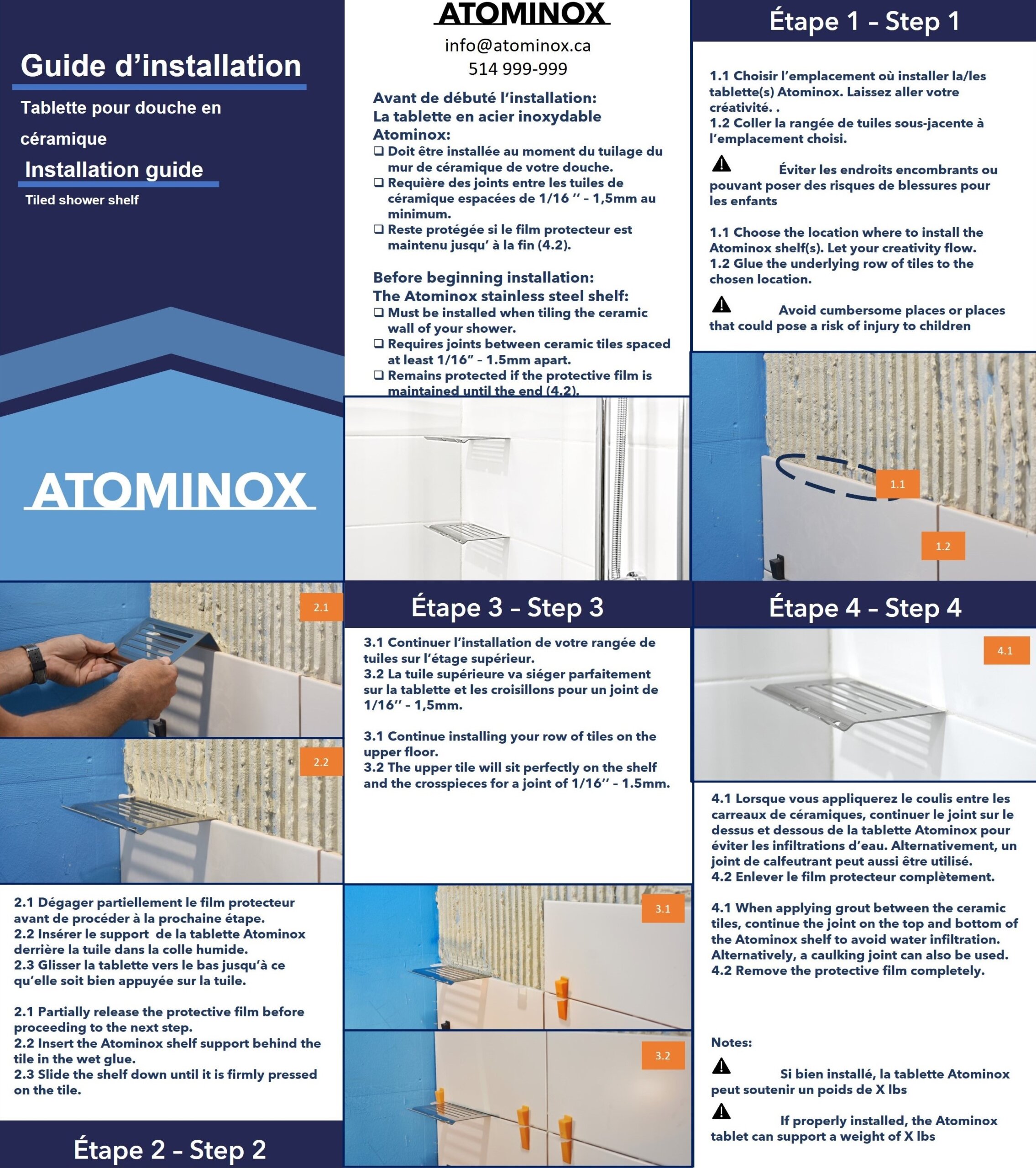 Nos tablettes sont conçus pour être installé au moment du tuilage du mur de céramique. Cela leur confère une apparence pure et une durabilité incomparable.